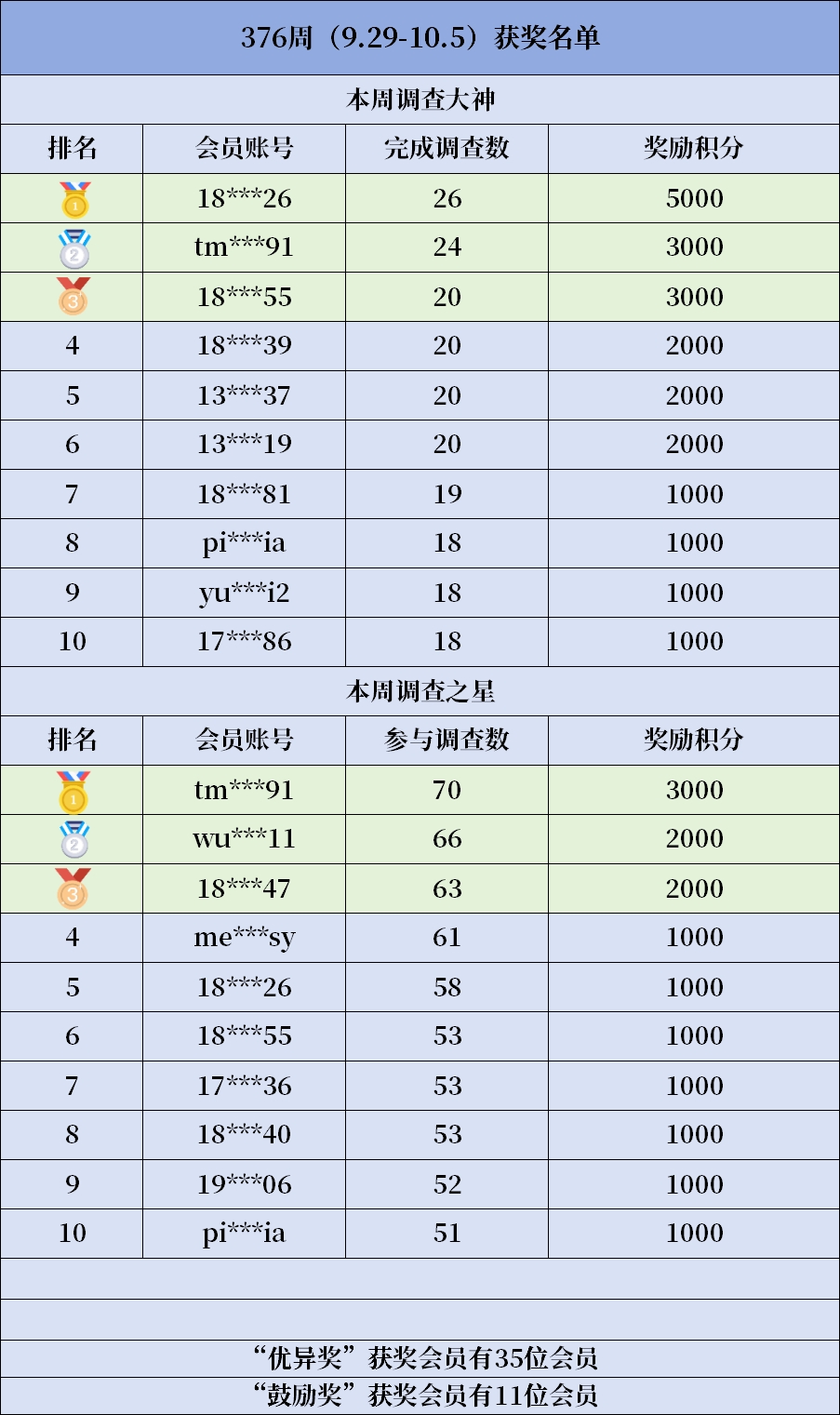“调查之星”活动第376周(2025年9月29日-2025年10月5日)奖励已结算发放,请再接再厉,赢取更多奖励! 下面公布获奖名单,恭喜获得“调查之星”和“调查大神”称号的会员!